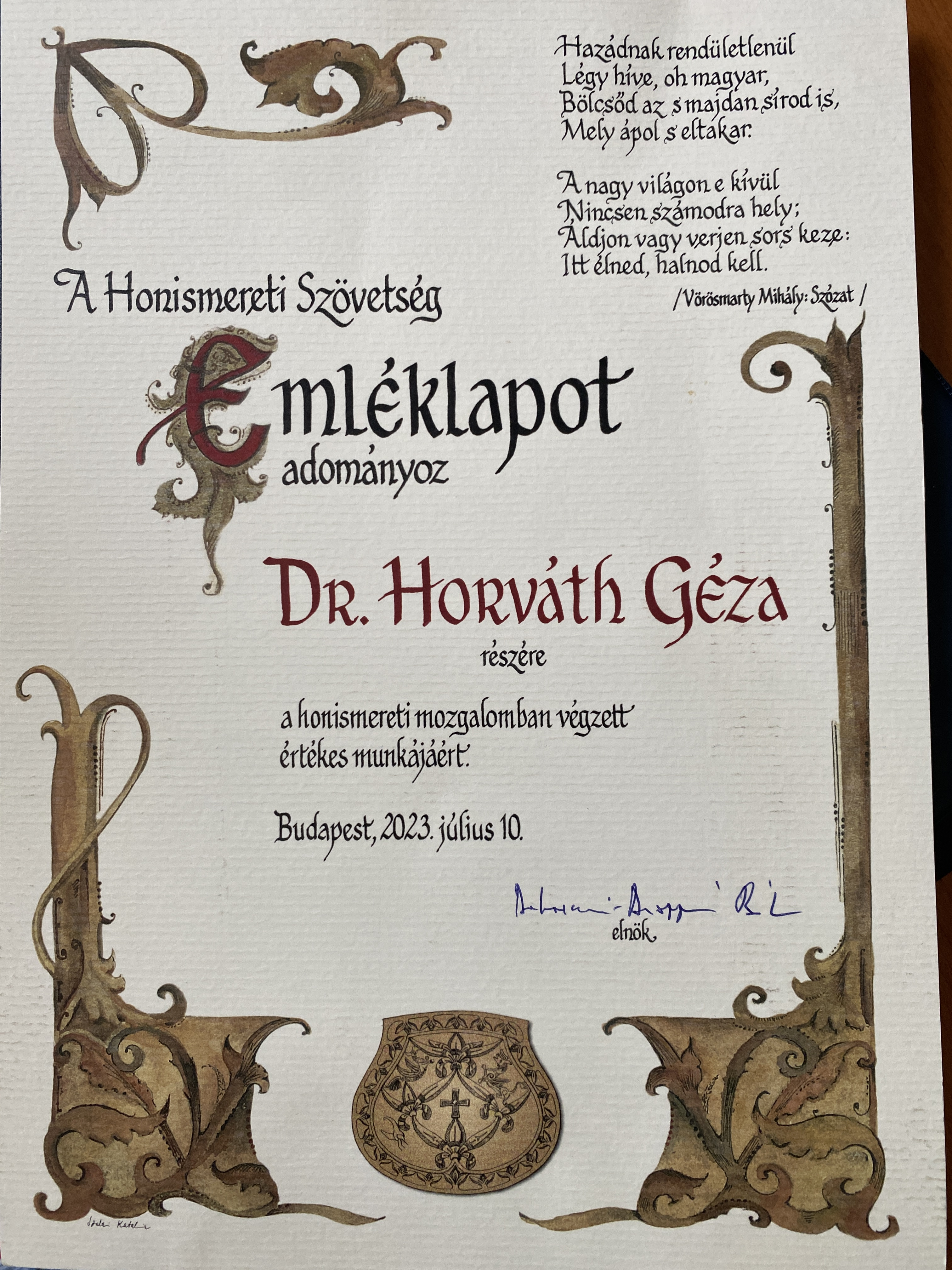 Július 10-én a honismereti mozgalomban végzett kiemelkedő munkájáért elismerésben részesült Dankó József helytörténeti kutató és Forróné Virág Zsuzsa egyesületünk elnöke. Ünnepélyes keretek között, az 50. Honismereti Akadémia megnyitóján, a Parlamentben vették át a Honismereti Szövetség Emlékérmét.
