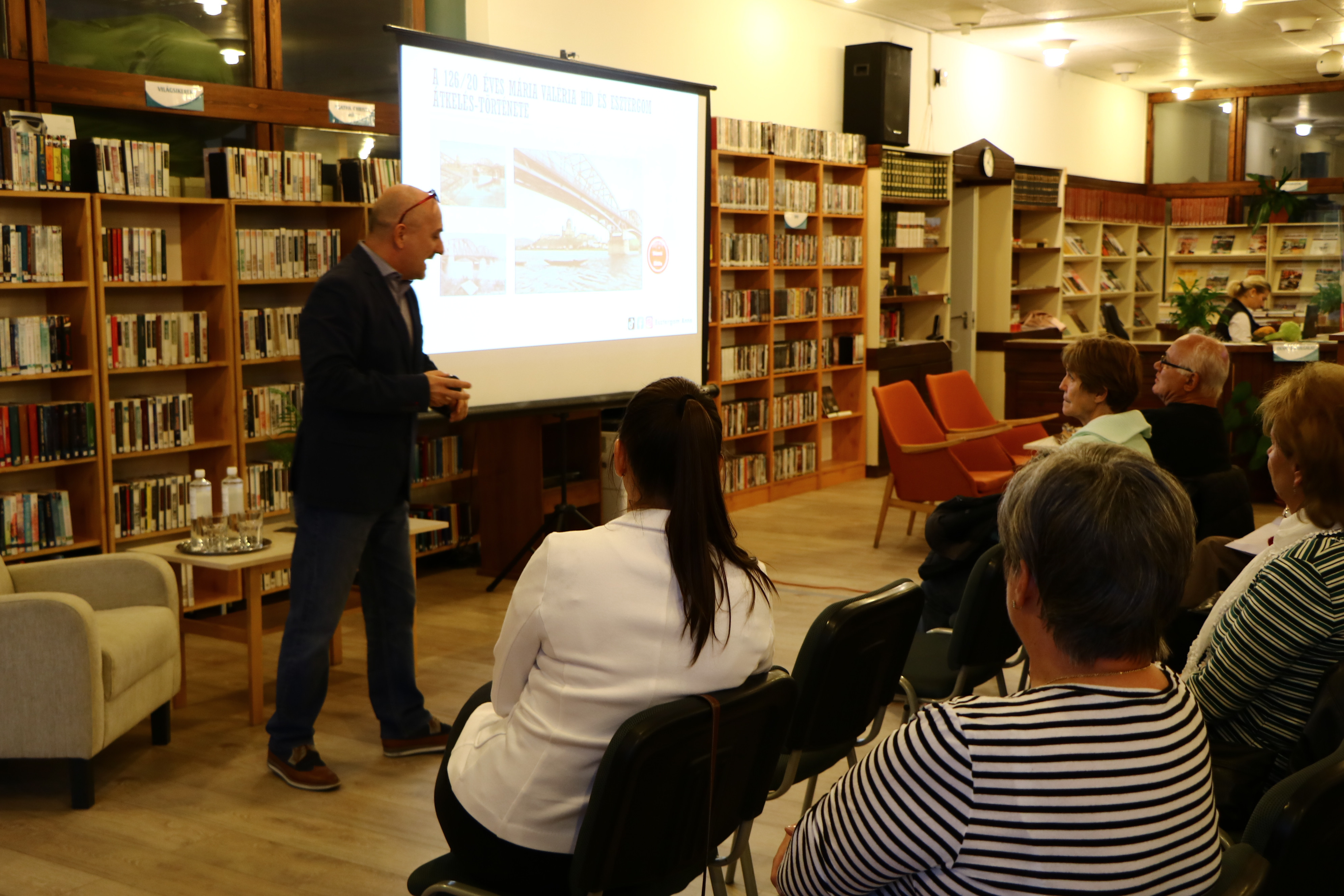 Október 11-én lesz húsz esztendeje, hogy az újjáépített Mária Valéria hidat átadták a forgalomnak. A vetített képes előadásból megtudtuk, hogy az átkelő gázló és rév használatának legrégibb írásos emléke a római korból, a Kr. u. 170-es évekből származik. Esztergom királyi székhellyé válása után, 1075-ben I. Géza a garamszentbenedeki apátnak „10 háznép hajóst” adományozott a kakati rév működtetésére. A királyi bevételt jelentő révvámot III. Béla és utódai több részletben az esztergomi káptalannak adományozták. 1215-ben II. Endre kötelezővé tette minden errefelé közlekedőnek a kakati rév használatát. A Mária Valéria híd építésének az ötlete 1892-ben született meg, és 1895. szeptember 28-án ünnepélyes keretek közt átadták a hidat. 1919. július 22-én este egy – talán véletlen - baleset következtében a Párkány felőli első mederpillérnél felrobbant egy töltet, és a hídív vége a vízbe csúszott. 1921 novemberéig egy gyalogos járóhidat építettek a hídszerkezetre. 1927. május 1-én adták át a forgalomnak újból a megjavított hidat. A II. világháború éveiben a híd harci célponttá vált, és 1944. december 26-án felrobbantották a három középső nyílását, és onnantól csonka hídként ismertük. 1990-ben elkezdték az újjáépítést szervezni és végül 2001. október 11-én átadták az újjáépített Mária Valéria hidat.Sárosi Attila bemutatta a híd történetét és még egy eredeti hídszegecset is kézbe vehettek a jelenlévők.A Mária Valéria híd összeköti a népeket, a gazdaságot, a kultúrákat. Kapocs, mely az alkotó emberi szellemet, a mérnöki munkát dicséri, és megsemmisíthetetlen.