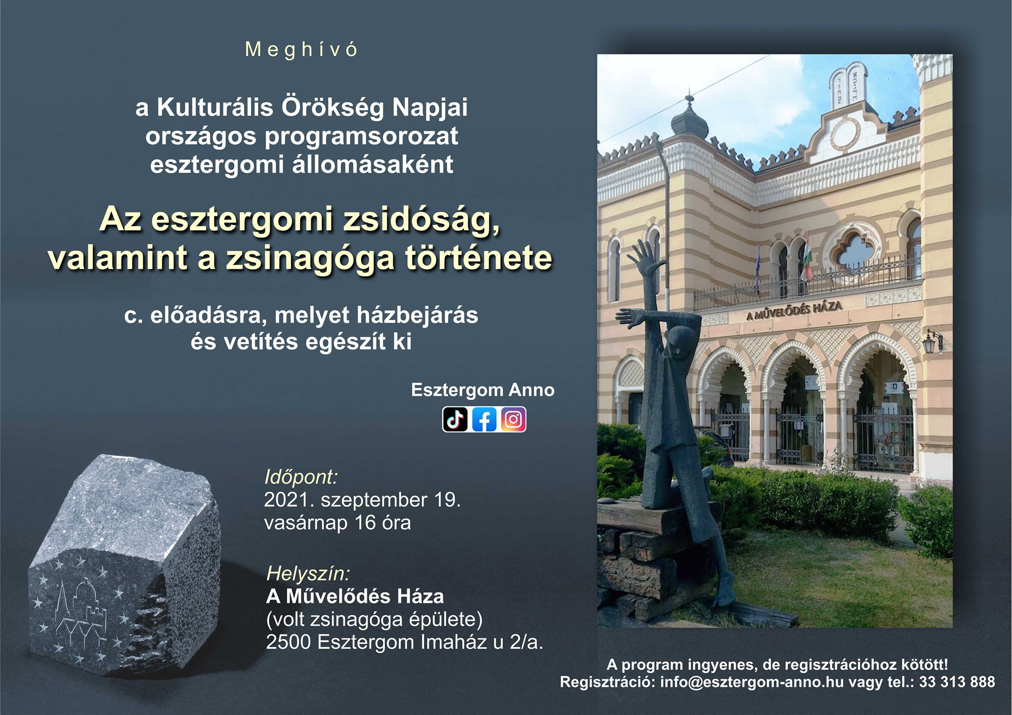 Az országos program-és rendezvénysorozat esztergomi állomásaként, a volt zsinagóga épülete (ma: "A Művelődés Háza")adott helyet a az esztergomi zsidóság és zsinagóga történetének bemutatására, melyet Sárosi Attila az Esztergom Anno tulajdonos-szerkesztője tartott.