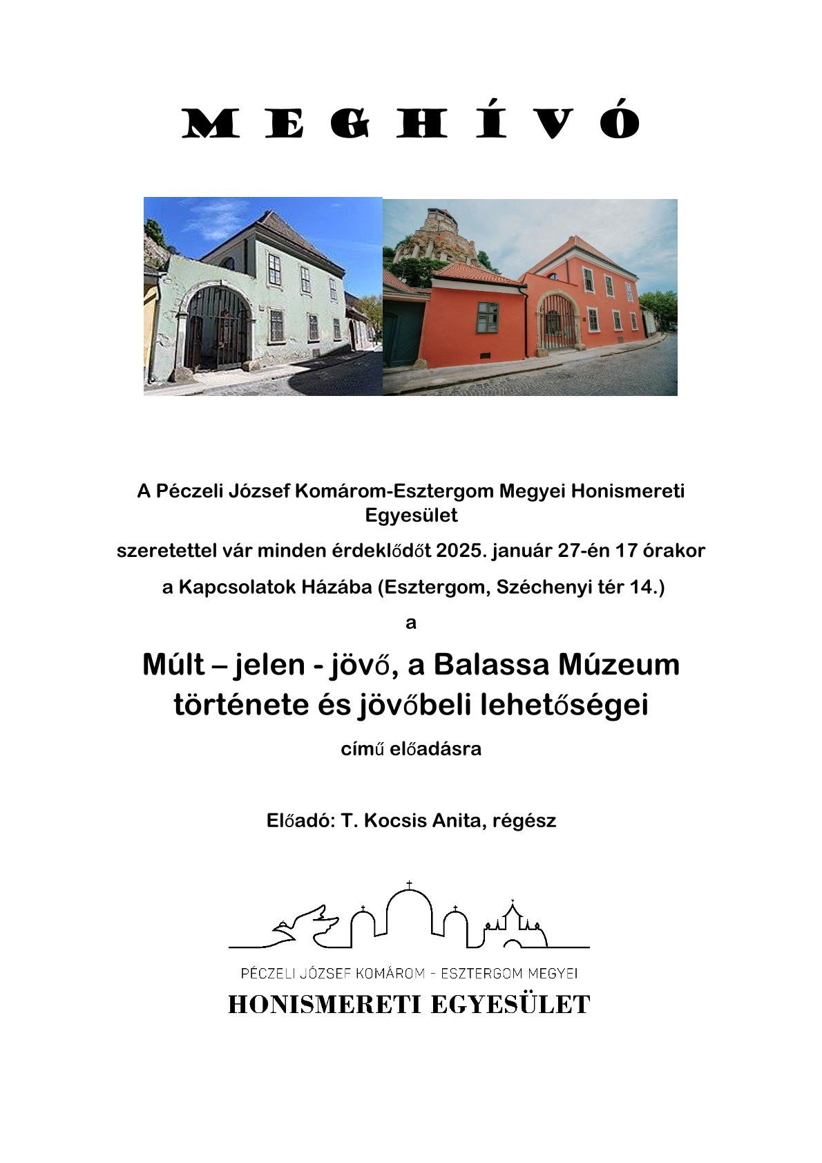T.Kocsis Anita a Balassa Múzeum régésze, megbízott intézményvezető, egyesületünk tagja, a Magyar kultúra napja alkalmából, Esztergom megyei jogú város egyik legrégebben működő közgyűjteményi intézményről tartott előadást egyesületünk tagjai és az érdeklődő esztergomiak számára.